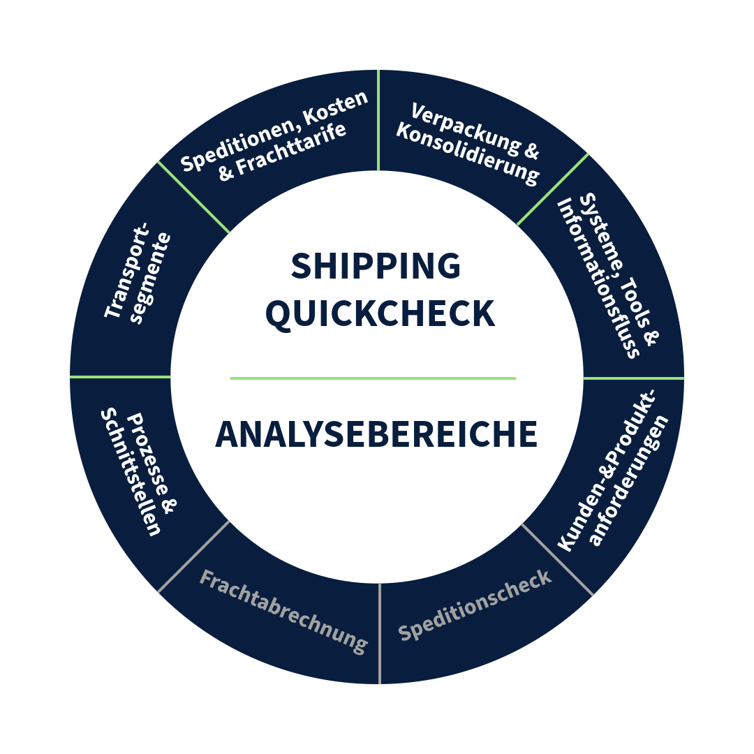 Nachfolgend geben wir Ihnen eine Übersicht welche Analysefelder Bestandteil von SHIPPING QUICKCHECK sind. Bitte beachten Sie, dass die Felder in grauer Schrift nur über Zusatzmodule zubuchbar sind und nicht Bestandteil des smarten Standardkonzepts sind.
